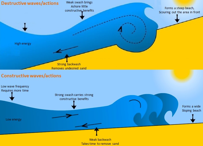 a. Gelombang pembangun atau pembentuk pantai (constructive wave) adalah karakteristik ketinggian gelombang mini dan kecepatan rambatnya rendah. Pada ketika gelombang itu pecah di pantai maka gelombang tadi akan mengangkut sedimen. Sedimen akan tertinggal pada pantai waktu genre pulang berdasarkan gelombang pecah masuk ke pada pasir atau pelan-pelan mengalir balik ke bahari tanggal.